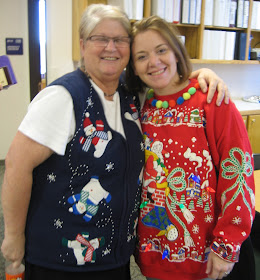 Today at work we had an ugly Christmas sweater contest. The runner-up (below left in red) embellished a (pretty ugly to start with) sweatshirt with flashing lights, and pom-poms around the neck. The winning sweater (below right) was completely homemade, with tinsel around the cuffs, tinsel and pom-poms at the neckline and hem (and on the tree, and all over), and little tiny presents under the tree and on one shoulder, and a gift decoration as the star of the tree. I don't think this sweater is ugly - I think it's quite beautiful! I would wear it!